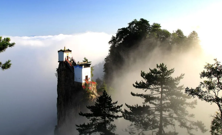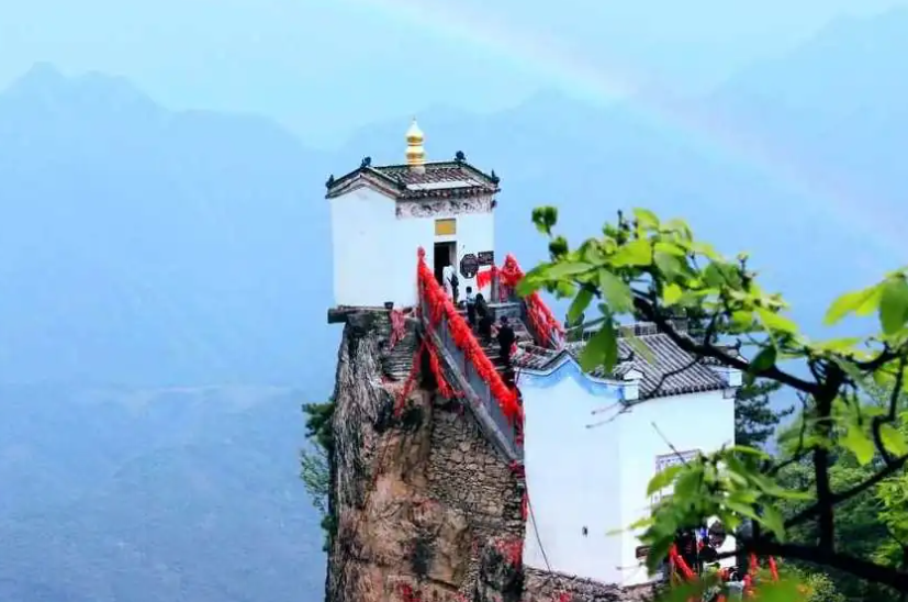 凌空翘首于万仞绝壁之上,三面悬于万丈深渊,是用4根石柱插入石缝,仿若云端上的仙景。