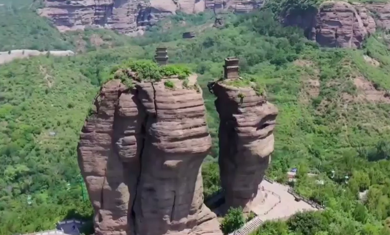 北峰较为粗大,南峰则上粗下细、看起来有些“摇摇欲坠”。两座石峰四面均为陡峭的丹崖绝壁,高不可攀,近代以来尚未有人仅凭人力成功登顶。