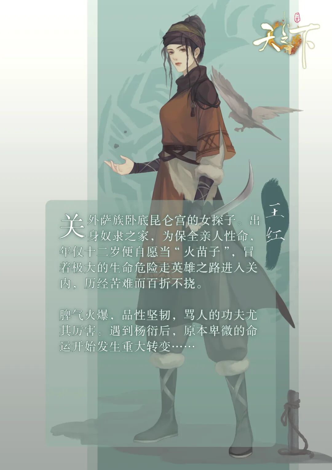 关外萨族卧底昆仑宫的女探子。出身奴隶之家,为保全亲人性命,年仅十二岁便自愿当“火苗子”,冒着极大的生命危险走英雄之路进入关内,历经苦难而百折不挠。