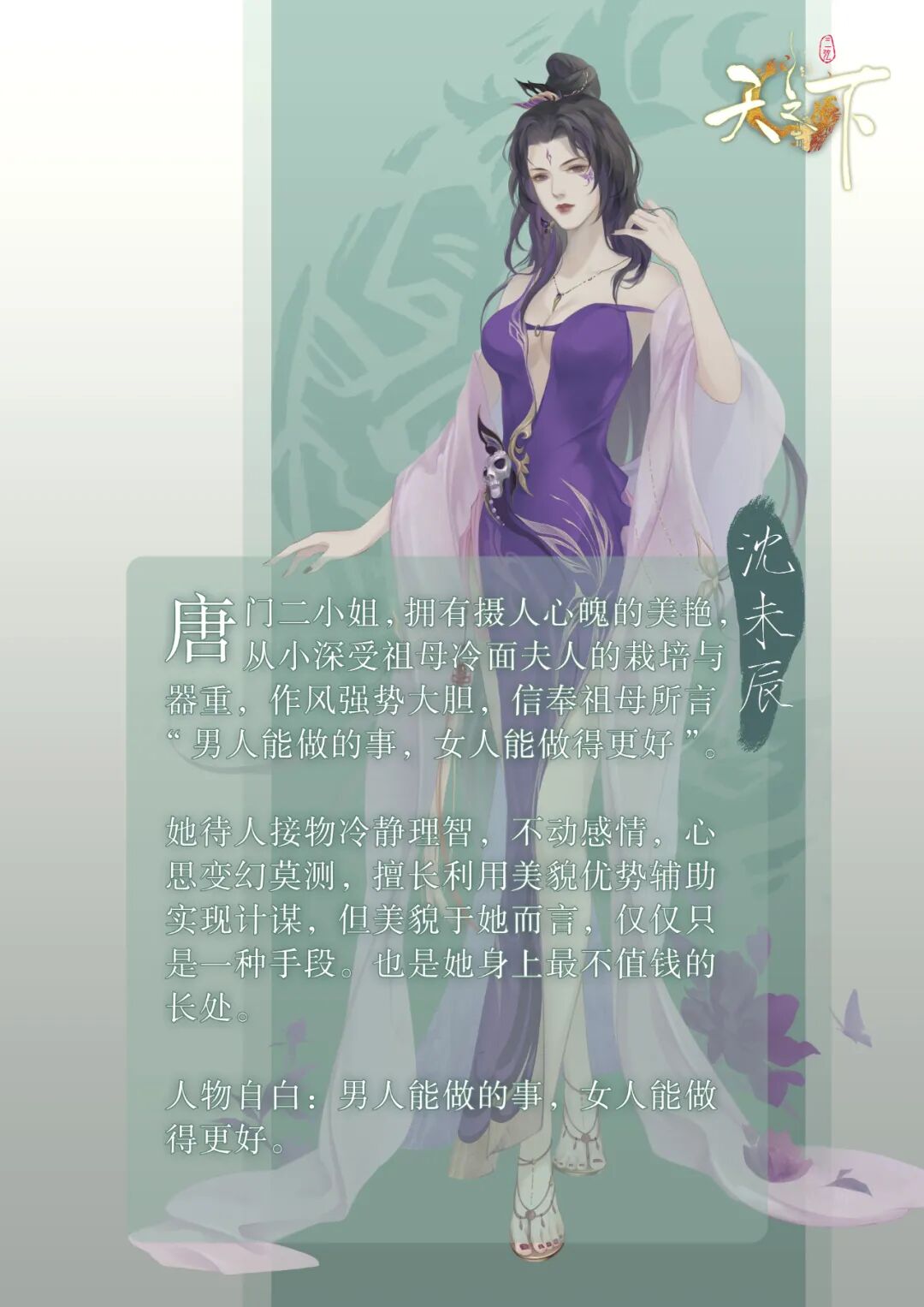 唐门二小姐,拥有摄人心魄的美艳,从小深受祖母冷面夫人的栽培与器重,作风强势、大胆,信奉祖母所言“男人能做的事,女人能做得更好”。