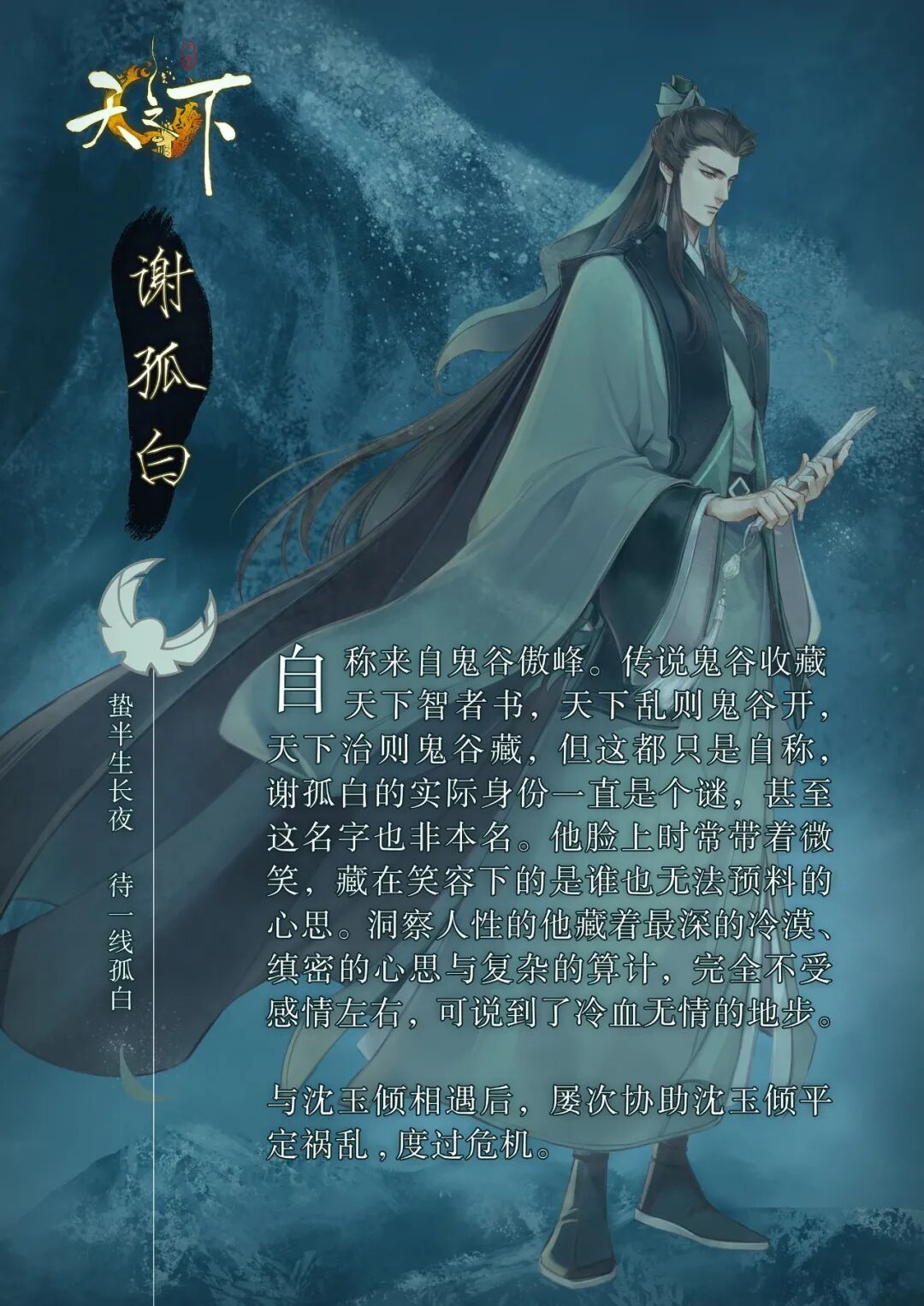 此人来历不明,甚至谢孤白这个名字都可能不是本名。他自称来自鬼谷:天下乱则鬼谷开,天下治则鬼谷藏。