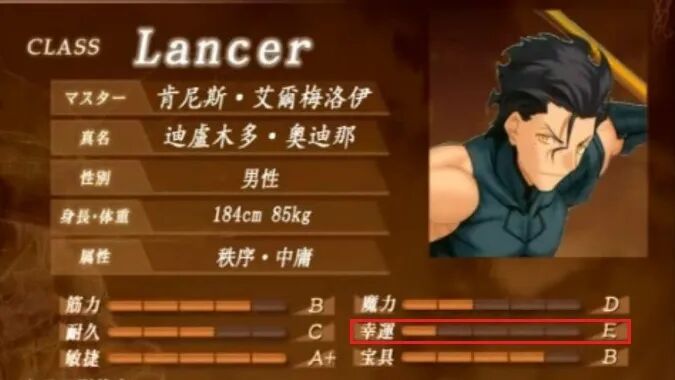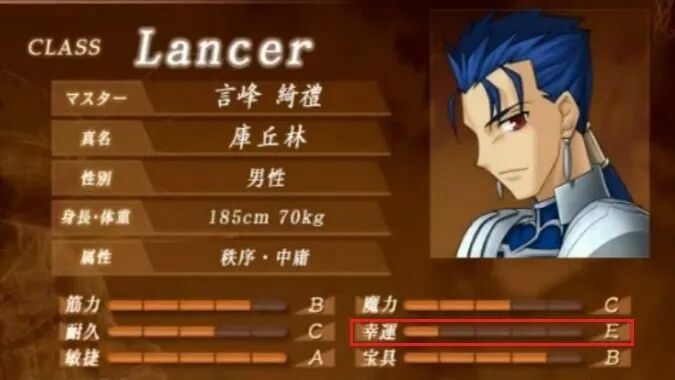 同时因为《Fate系列》中最早登场的两位枪兵幸运设定均为“E”