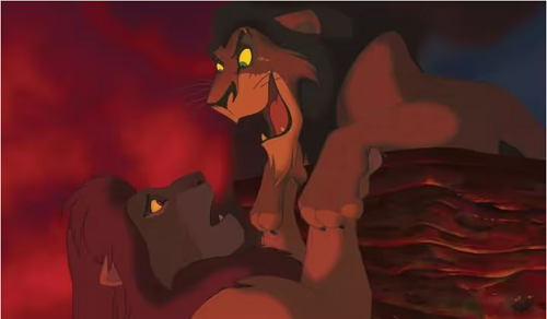 辛巴马上就要掉到悬崖下面的火坑里,刀疤叔叔得意地对濒死的他贴耳说出了自己的阴谋