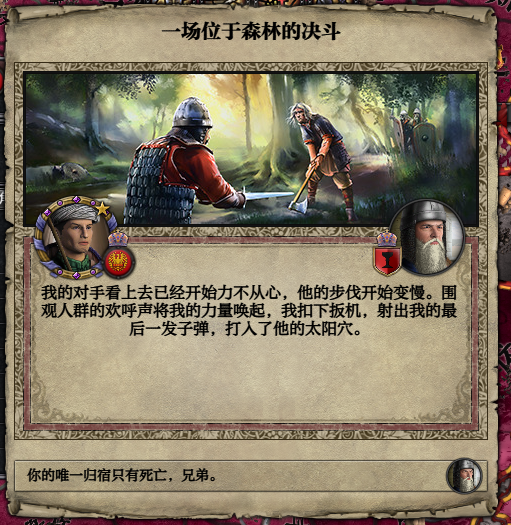 在一场荣耀的“比剑”决斗之中,你掏出火绳手枪将对手击毙,从而获得了决斗胜利