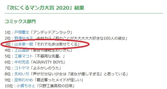 本作获「下一部漫画大赏2020」漫画部门第3位