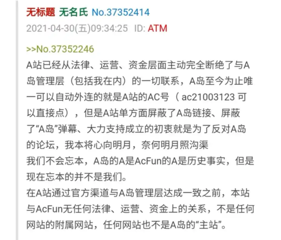 因此2021年4月,ATM正式在岛内发文称,A站已从资金、法律、运营等层面完全断绝了与A岛管理层的一切联系,甚至在站内屏蔽了“A岛”相关链接和弹幕
