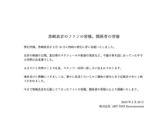 事务所于其个人官网宣布黑崎真音已于同月16日病逝