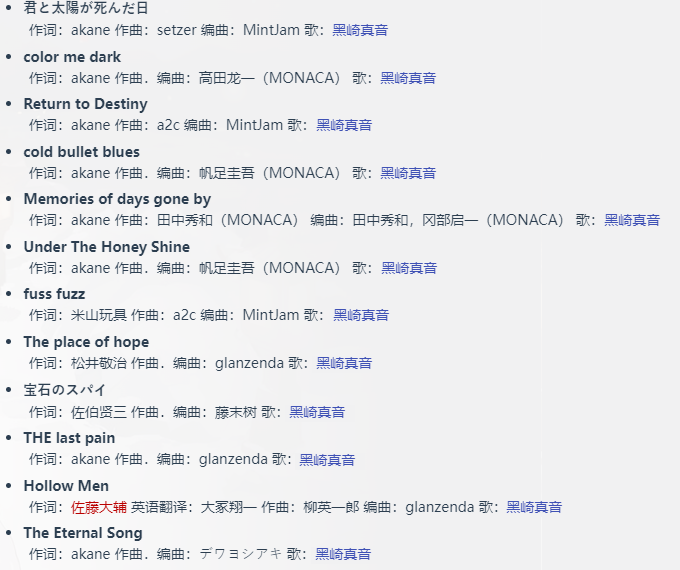 演唱过《灼眼的夏娜Ⅲ》、《加速世界》和《噬血狂袭》等作品的歌曲