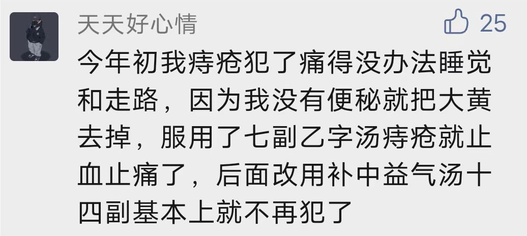 回过头来看,乙字汤这个方子,把痔疮背后的原因都兼顾到了,有理气活血,同时还能清热燥湿,还有提气的思路,真是思路周全的一个方子。