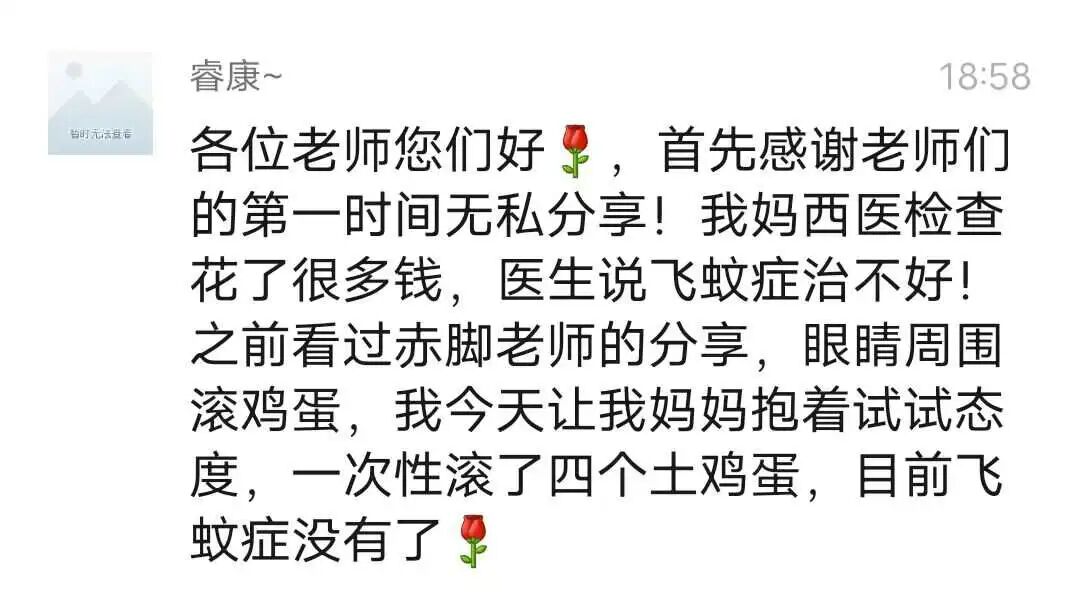 第一个方法,最好用的外治法,滚鸡蛋。这个方法,咱们普通老百姓真的要知道,既安全还省钱,关键是没有门槛,所有人都能操作。咱们有很多人验证过了,滚鸡蛋用来治疗飞蚊症,效果非常不错。