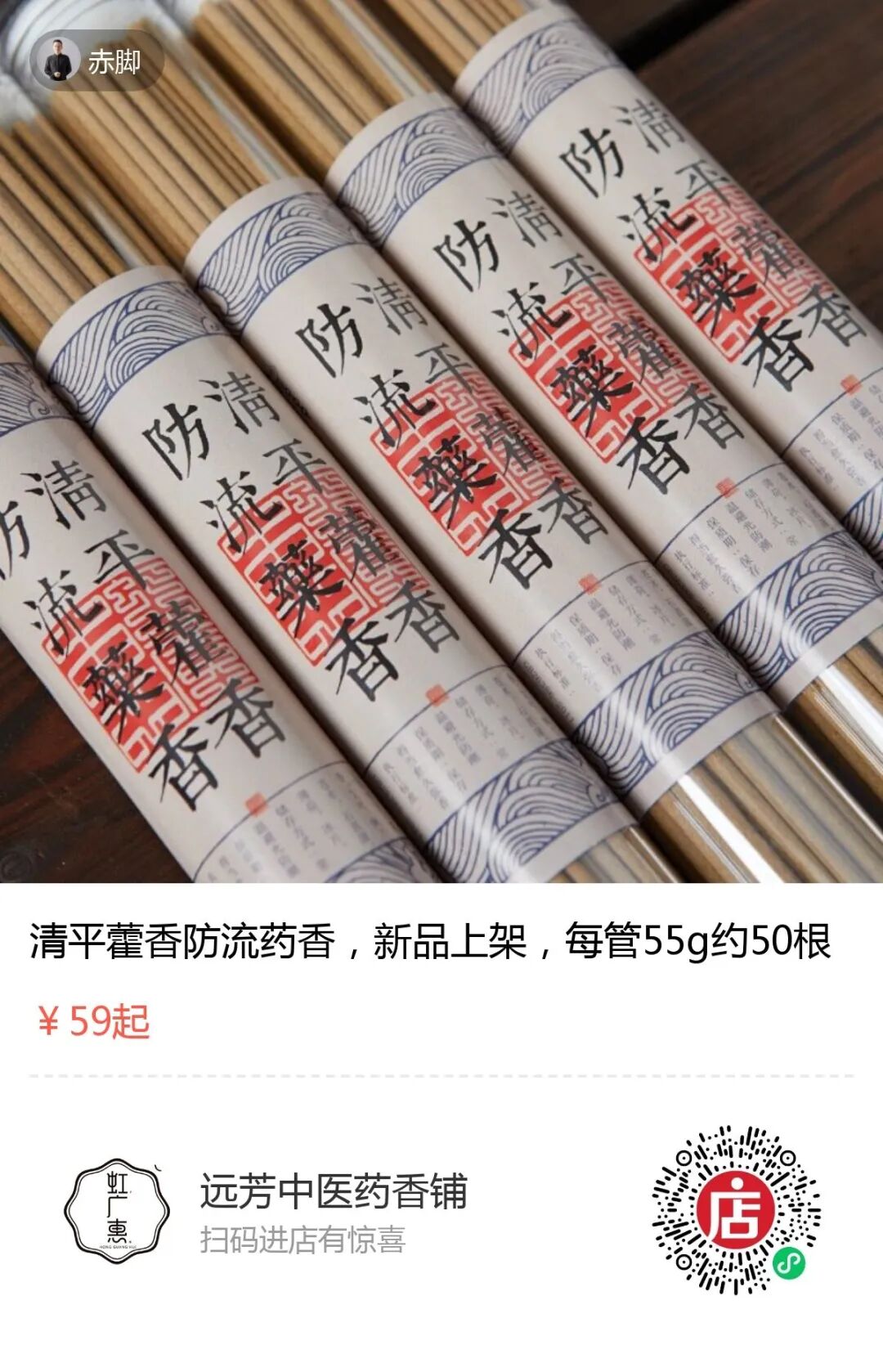 远芳刚研制出一款预防流感的香,以“苍术+艾草+藿香”为主要原材料,可芳香辟秽,有效阻止流感病毒进入呼吸道,性价比非常高,59元/50根,另外还赠送价值48元的香囊一个。