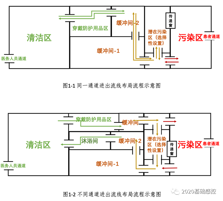 1.潜在污染区包括有相应功能用房设置和无功能用房设置两种基本形式。有相应功能用房设置的,原则上与污染区之间不设置人员出入口,物品通过符合设计要求的传递窗传递;无相应功能用房设置的,仅起通道和缓冲作用,可与规范设置的脱除防护用品房间或缓冲间合并设置。