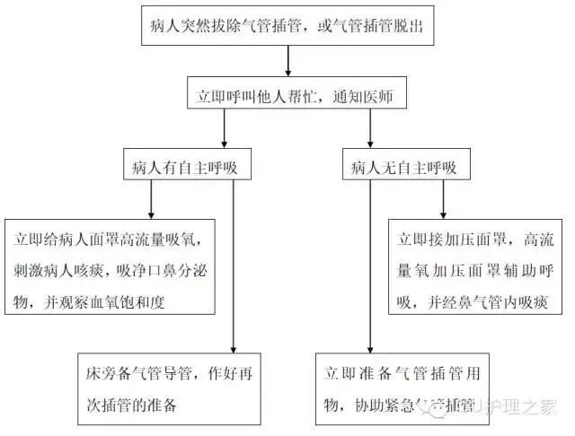 1、密切观察生命体征同时立即报告医生2、如脱管期间仍使用呼吸机者,立即先给予面罩供氧3、立即备抢救物品于床头:呼吸机.适合患者的气管插管及导丝.麻醉药.抢救药品,检查气管插管的套囊是否漏气4、医生置管期间密切观察生命体征及时报告医生5、如置管期间置管困难的血氧过低立即给予无创呼吸机辅助过度6、置管后协助医生给予固定7、置管后充分吸痰8、整理用物及床单位
