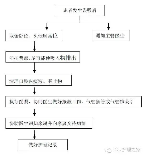 1.当发现患者发生误吸时,立即使患者采取俯卧位,头低脚高,叩拍背部,尽可能使吸入物排出,并同时通知医生。