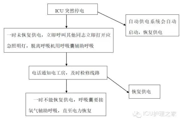 ICU突然停电,一般自动供电系统会自动启动,恢复供电,如一时未恢复供电,立即呼叫其他同志立即打开应急照明灯,脱离呼吸机用呼吸囊辅助呼吸,并电话通知电工房,及时检修线路,恢复供电。一时不能恢复供电,呼吸囊要接氧气辅助呼吸,直至电力恢复。