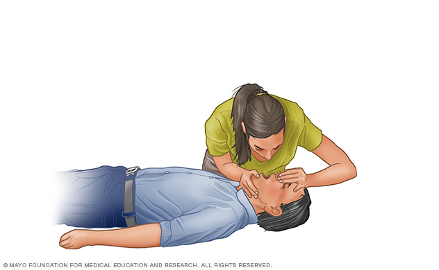 如果你接受过CPR培训并已经进行了30次胸外按压,可以用“仰头抬颌法”开通患者气道。手掌放在患者前额部轻轻向后压。用另一只手轻轻向前提起下颌以打开气道。