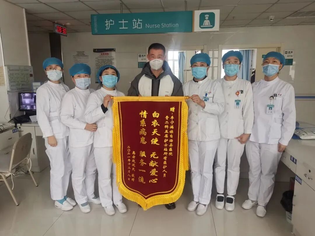 正是患者住院期间护理人员对病人的亲切问候与悉心照料,使我们得到了病人及家属的认可,所以我们收到了患者送给护理人员的锦旗。由于疫情的原因,护理人员不仅要完成治疗工作,更要承担着患者及家属的生活方面的照料,这面锦旗恰是对我们最大的认可。朴实的语言、鲜艳的锦旗,展现的是医患之间彼此的真诚与和谐。这也激励着我们要更加努力的工作,更好的为每一位患者服务。