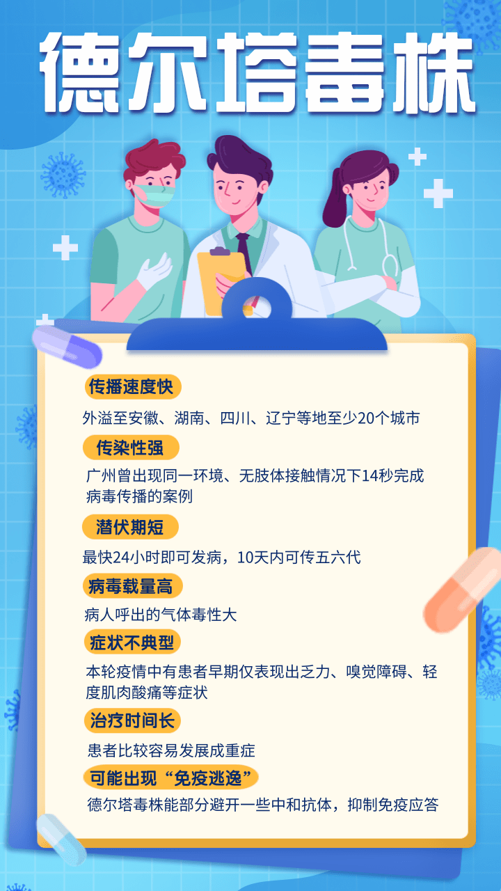 根据世界卫生组织的研究,德尔塔病毒和其他的非VOC和老的病毒株比起来,传播率增加近100%,就是增加了一倍。近期广东省暴发的德尔塔变异病毒引起的新冠肺炎疫情,传播动力学研究也提示,传染力也比以前的流行毒株增加了1倍。同时,反映它传播能力的还有个非常重要的指标就是传播速度,主要是它的潜伏期和传代间隔都有所缩短,大概平均缩短了1-2天。过去潜伏期我们知道大概是5-6天,现在大概是4天多。它的传代间隔过去是4、5天,现在变成了3天左右。