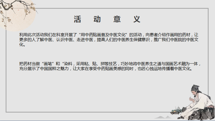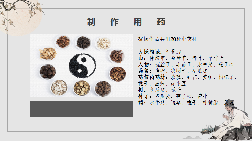 中医院的医护们用灵巧双手,把一味味苦涩的中药材,玩出了新花样。他们把中药材当做“画笔”和“颜料”,采用粘、贴、拼、嵌等技艺,精心制作而成的一幅幅精美的画作,巧妙地将中医养生之道与绘画艺术融为一体,充分展示了中医国粹之魅力,让我们享受中药贴画美感的同时,也匠心独运地传播着中医文化,生动地展现了中医人精诚团结、积极向上的精神面貌。
