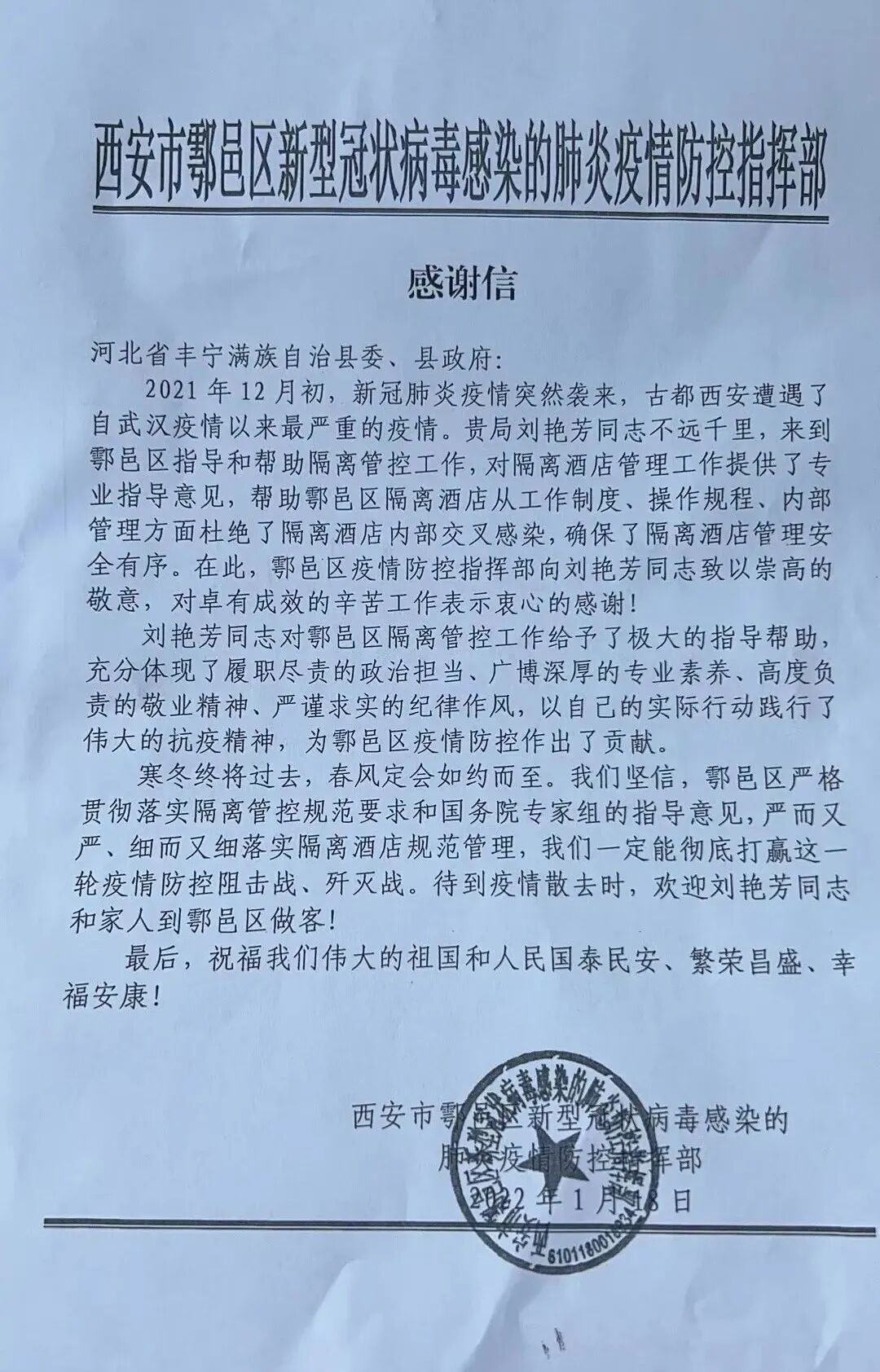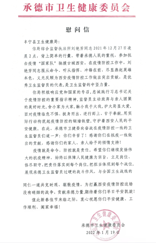 刘艳芳同志说:我很荣幸能够代表承德卫生监督人参加河北省支援西安抗疫疫情的工作,在抗击疫情的阻击战中,为河北省卫生监督尽一份力量,充分展现了我们监督“蓝军”闪亮的风采,同时也感谢各位领导和各行各业的朋友们的关心和支持,在千里之外仍倍感温暖!