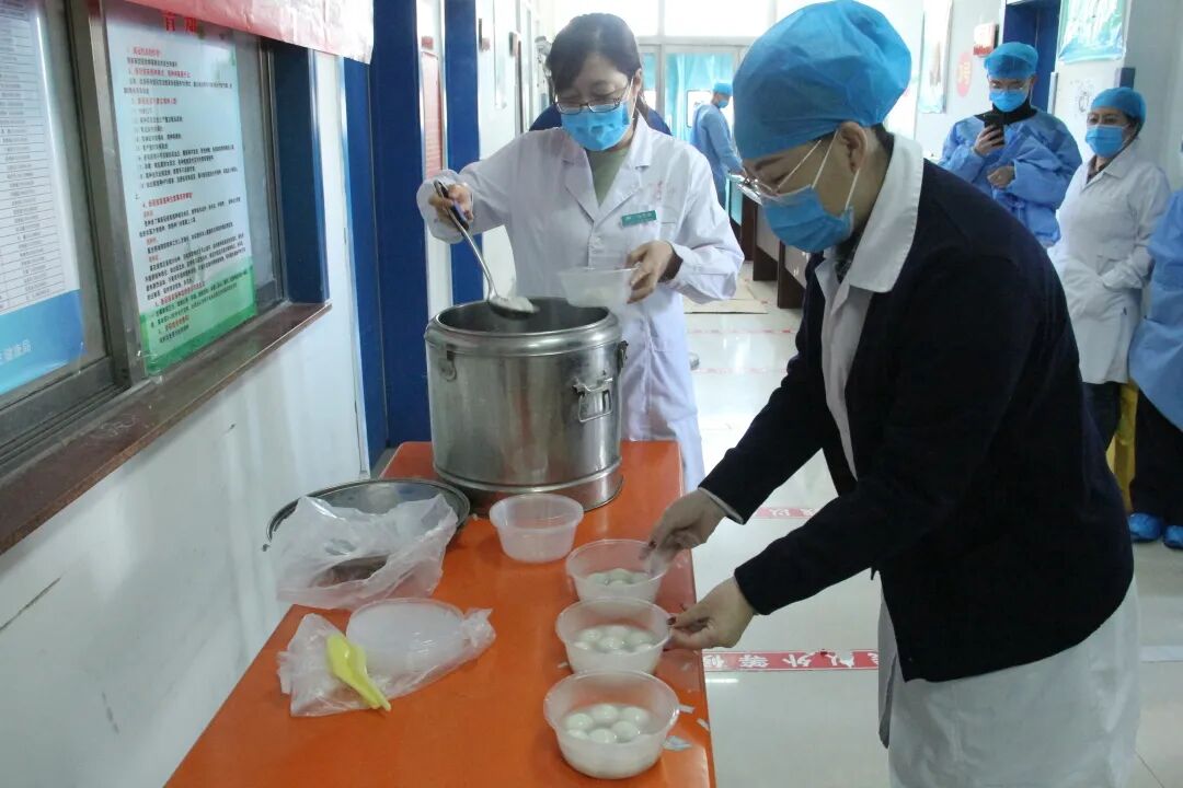 "大家过节好!""大家辛苦了!"声声祝福问候,和一碗碗的汤圆,带来了医院对职工们的关怀;刘院长一行的到来,让接种点的职工们都非常惊喜和感动。