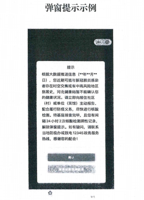 一、同时空伴随、重点涉疫场所驻留、中高风险地区驻留人员,弹窗提示:“根据大数据推送信息(*年*月*日),您近期可能与新冠肺炎感染者存在时空交集或有中高风险地区旅居史,河北健康码暂不能确认您的健康状况。请立即向居住社区(村)或单位(宾馆)主动报告,配合履行防疫义务,尽快进行核酸检测。待基层排查完毕,且您有间隔24小时2次核酸检测阴性记录,解除弹窗提示。如有疑问,请联系当地防疫办或致电12345政务服务热线,感谢您的配合!”