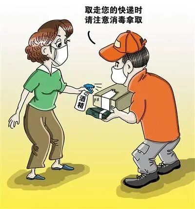 【收拆快递时这样做】① 接收来自境外和国内中高风险地区的快递、物品时,请先戴上口罩和手套。② 手套可选用塑胶或一次性手套,口罩可选用一次性医用口罩。减少直接接触和交流。③ 尽可能在固定地点取件,实现无接触交接;如需当面签收,请与快递员保持安全距离。④ 拆件时尽量在户外进行,外包装不要拿回家中,要按照生活垃圾分类处理;如需拿回家中,拆快递、货物前,可先用75%的酒精或含氯消毒液等对外包装及物品进行擦拭消毒,但要注意酒精易燃性强,切勿进行大面积喷洒消毒。⑤ 同时,尽量避免在封闭的空间内拆快递,保持室内通风良好。处理完邮件后及时摘下手套,认真进行手消毒或清洗双手,更换口罩,避免用不清洁的手触碰口、眼、鼻。