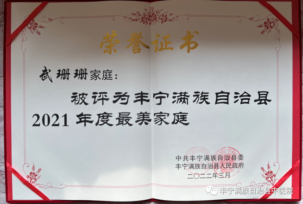 2022年3月8日,在县妇联组织召开的“三八”国际妇女节纪念表彰大会上,我院护士武珊珊家庭,荣幸的获得了妇联颁发的“最美家庭”称号。致敬抗疫最美家庭,以榜样的力量带动更多家庭培育家庭美德,传承良好家风。下面让我们走进身边的典型,讲述身边的感人故事,共同感受爱国爱家的家国情怀和创新实干的时代精神。