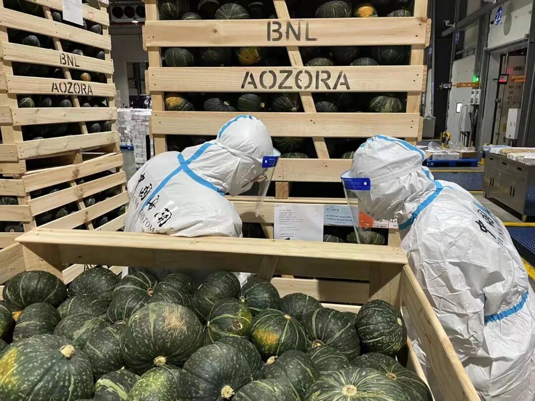 3月29日,一批进口南瓜在上海口岸接受检疫查验。
