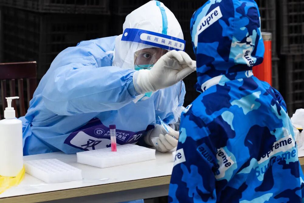 5月2日,在上海浦东北蔡镇莲中居民区,来自杭州口腔医院的援沪医务人员在给居民做核酸采样。