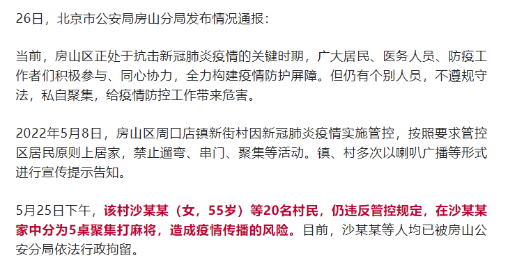【警示】北京房山管控区20名村民聚集打麻将,行拘!