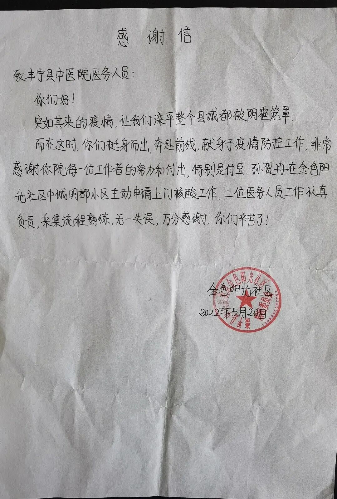 6月12日,丰宁中医院收到一封来自滦平县金色阳光社区寄来的感谢信,信中对滦平疫情期间丰宁中医院前去支援疫情防控的医护们表示感谢,特别是对主动申请进行上门核酸采样的付莹、孙贺冉两位护士的认真负责、辛苦付出表示感谢。