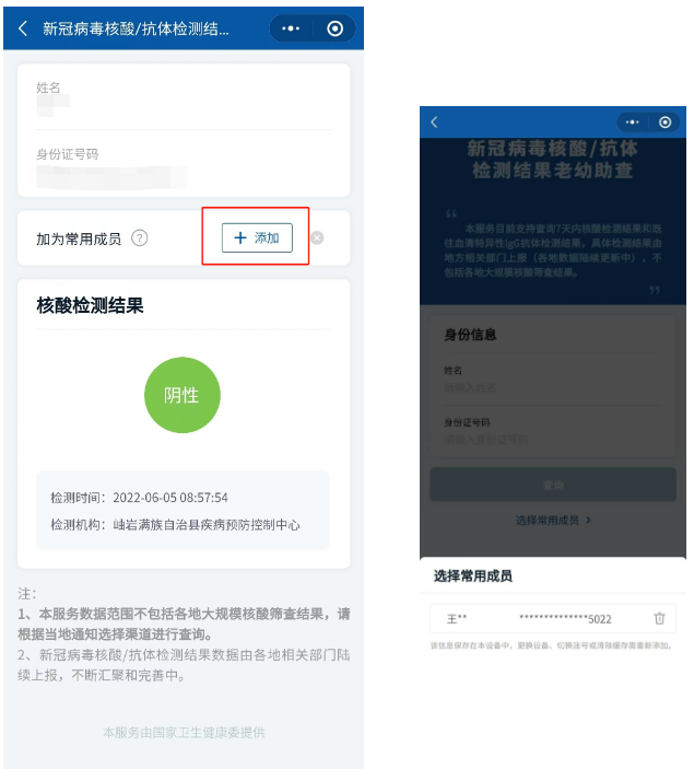 常用成员功能:支持添加5名常用成员,后续可快捷查询核酸/抗体检测结果。常用成员信息将保存在当前设备中,请勿在公共或不可靠的设备上储存添加,如更换设备、切换账号或清除缓存需重新添加。