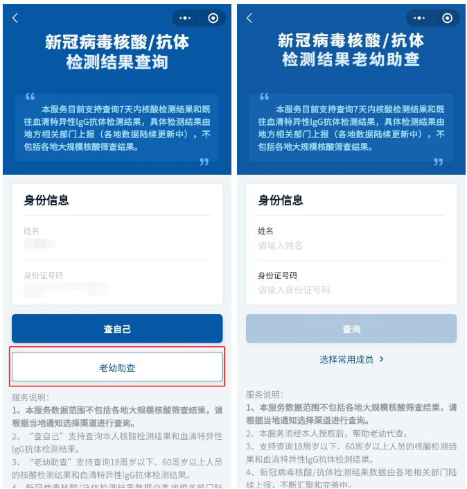 “老幼助查”功能:支持查询18周岁以下、60周岁以上人员7天内的核酸检测结果和血清特异性IgG抗体检测结果,数据由各地相关部门上报。