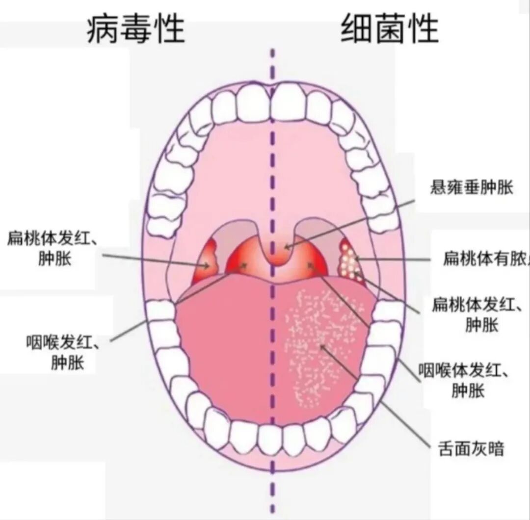 扁桃体发炎是一种非特异性炎症,好发于儿童和青年群体之间。扁桃体发炎分为两种:一种是病毒性扁桃体炎,一种是细菌性扁桃体炎,在局部症状表现上会有一些差异: