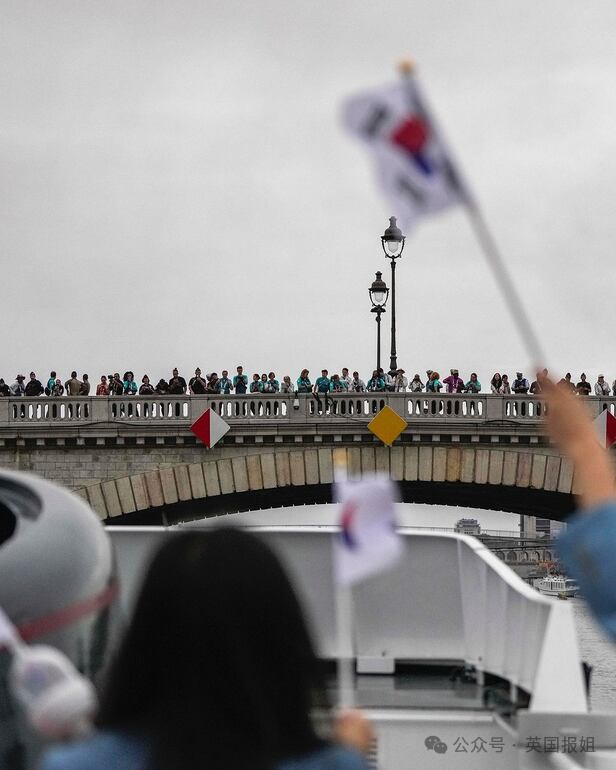 其他国家的照片清晰地显示了运动员的脸和国旗,但韩国的照片不仅没有运动员的脸,国旗也模糊不清。照片的焦点居然还是聚集在塞纳河大桥上的游客,而不是韩国运动员。