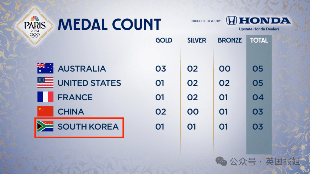继开幕式上把韩国名字念成朝鲜后,韩国队又被迫迎来了新的震撼:电视转播人员给奖牌榜上的韩国,挂上了南非国旗...