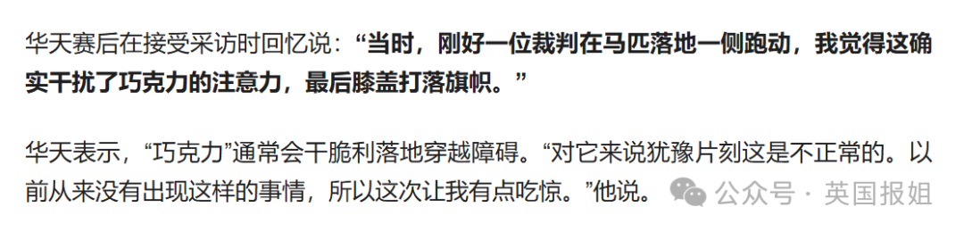 另一边,中国选手华天参加马术比赛时,有工作人员冲进现场,导致马匹有一瞬间的受惊。华天也因此被罚分,排名从第3位滑落至32位。
