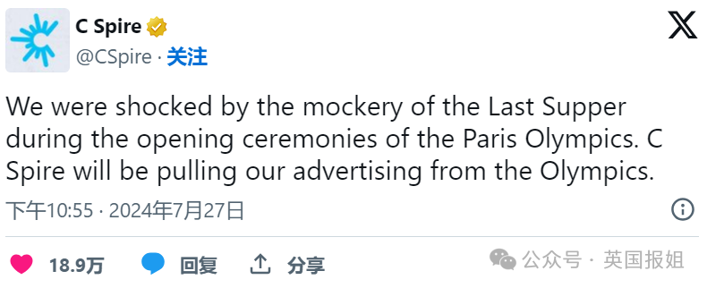 还有赞助方表示因为对开幕式不满选择撤资。总部位于密西西比州的电信技术公司C Spire宣布,由于开幕式对《最后的晚餐》的嘲弄,将撤回在本届奥运会投放的所有广告。