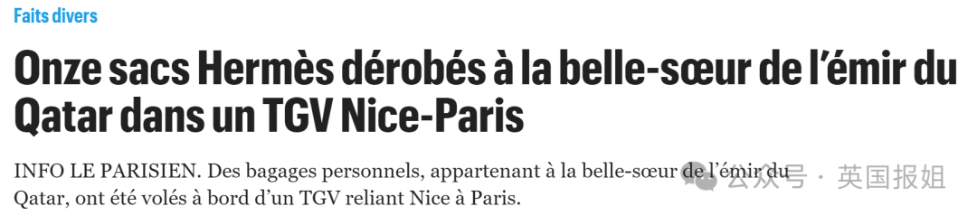 治安同样是个大问题,周六,卡塔尔埃米尔(埃米尔,等同于国家元首)的嫂子在尼斯开往巴黎的高速列车上被盗,11个爱马仕包包不翼而飞。