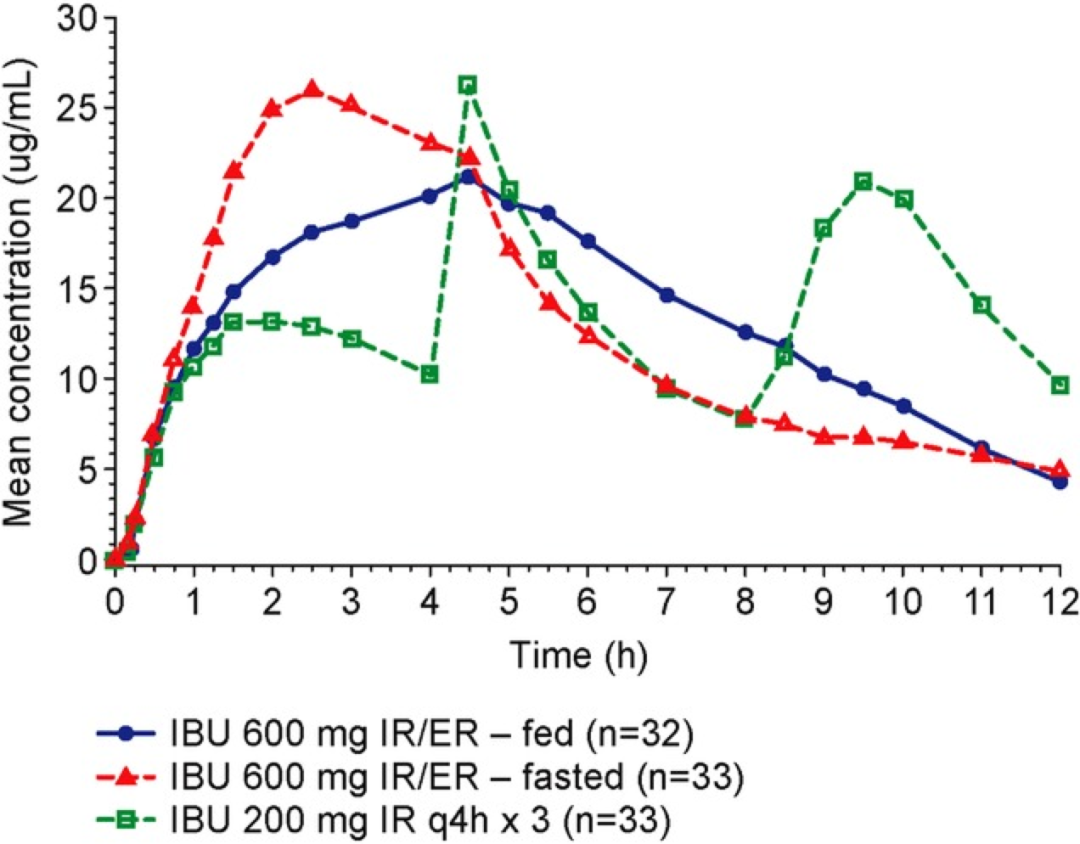 Legg T, Paluch E, Jayawardena S. Single‐and multiple‐dose pharmacokinetics of immediate‐release/extended‐release ibuprofen tablets[J]. Clinical Pharmacology in Drug Development, 2017, 6(1): 36-43.