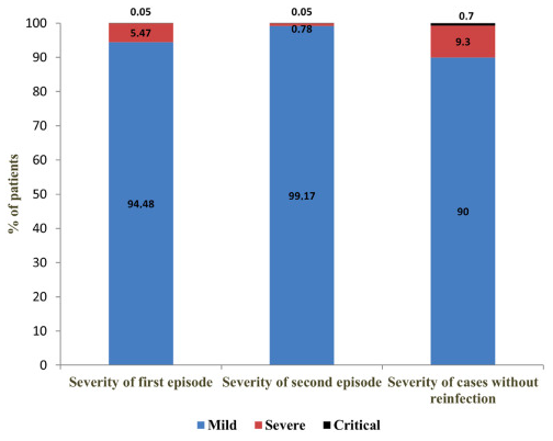 重复感染人群的首次感染阶段、重复感染人群的二次感染阶段、未发生重复感染人群的轻症、重症、危重症占比