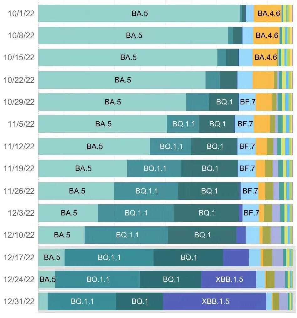 最近美国的流行毒株,也快速更替为了进一步变异的 XBB.1.5。最近一周感染的四成是 XBB.1.5。