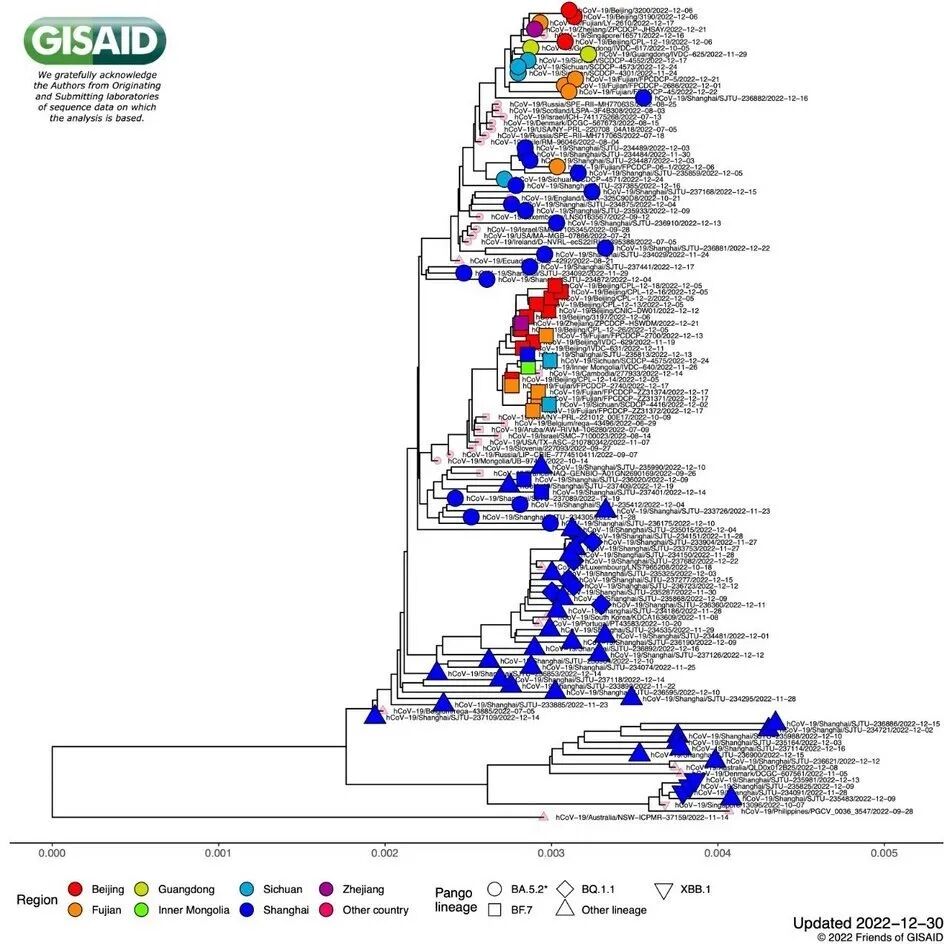 其中倒三角就是 XBB.1。能看到蓝色的上海上传数据里有少数倒三角图形,也就是测序测到了 XBB.1。但 GISAID 并没有全部的测序数据,上海之外的其他地区,也有存在 XBB 的可能性。