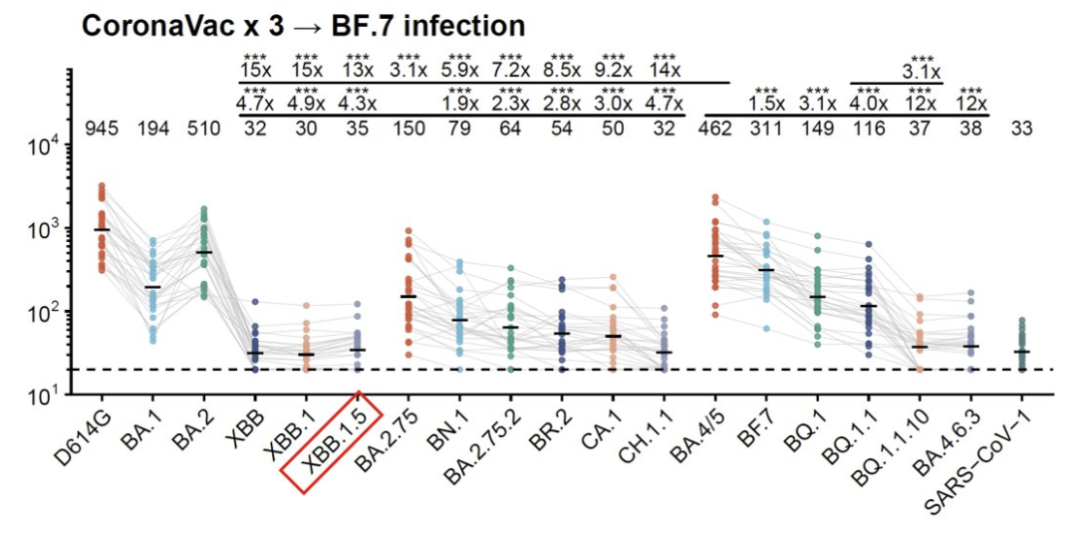 抗体水平是衡量免疫能力的一种方式。来自北京大学曹云龙教授团队的数据显示,对于接种过疫苗,甚至感染过的人,抗体中和 XBB 的能力很差。