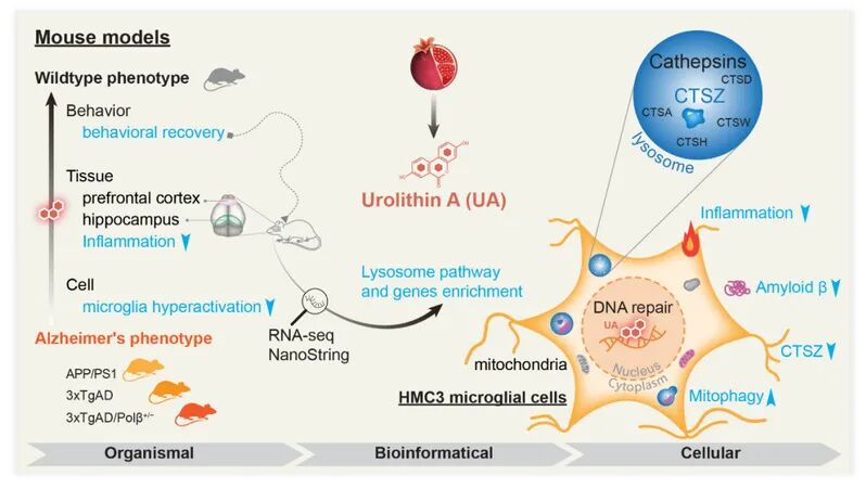 研究报道了长期的尿石素A(Urolithin A, UA)治疗可改善阿尔茨海默病(AD)小鼠的学习、记忆和嗅觉功能,调节其免疫反应,减少AD小鼠脑中的Aβ淀粉样蛋白斑块和tau蛋白的神经纤维缠结。揭示了UA通过调节组织蛋白酶Z(CTSZ)恢复溶酶体功能的分子机制,表明UA具有极大的临床转化潜力。