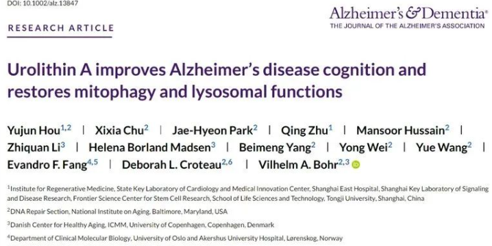 2024年5月16日,上海市东方医院(同济大学附属东方医院)干细胞基地再生医学研究所/同济大学生命科学与技术学院侯羽君教授团队与美国国立卫生研究研究院的Vilhelm Bohr教授团队在国际阿尔茨海默病协会官方杂志Alzheimer’s & Dementia(《阿尔茨海默病与痴呆》)上在线发表了题为“Urolithin A improves Alzheimer's disease cognition and restores mitophagy and lysosomal functions”的最新研究成果。