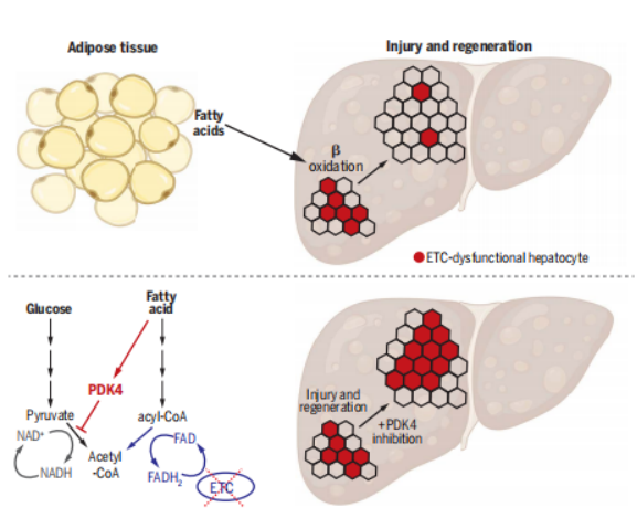 研究发现,在肝脏再生过程中,线粒体通过其代谢的不灵活性来保护再生肝脏的健康。这种不灵活性主要体现在无法通过线粒体β-氧化从外周脂肪酸产生乙酰辅酶A(Acetyl-CoA),从而抑制了ETC功能失调的肝细胞的增殖。