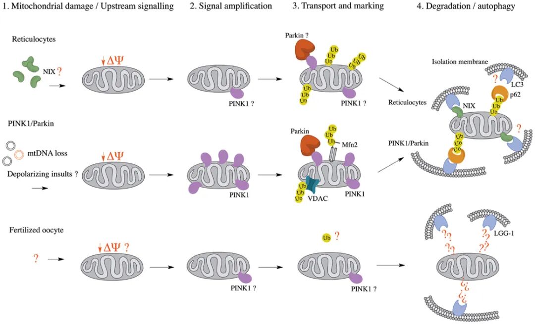 在正常情况下,PINK1(PTEN诱导激酶1)会在线粒体靶向序列的引导下进入线粒体内膜,随后被位于线粒体基质和内膜上的蛋白酶切割,再被释放到胞质中被泛素-蛋白酶体水解。然而,当线粒体受损时,其膜电位降低,导致PINK1在线粒体外膜上积聚。