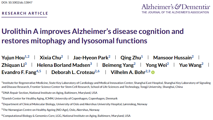 2024年5月16日,同济大学生命科学与技术学院、美国国家衰老研究所的研究人员在" Alzheimer's & Dementia "期刊上发表了一篇题为" Urolithin A improves Alzheimer's disease cognition and restores mitophagy and lysosomal functions "的研究论文。